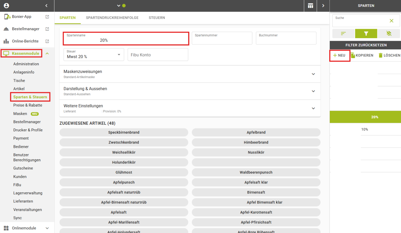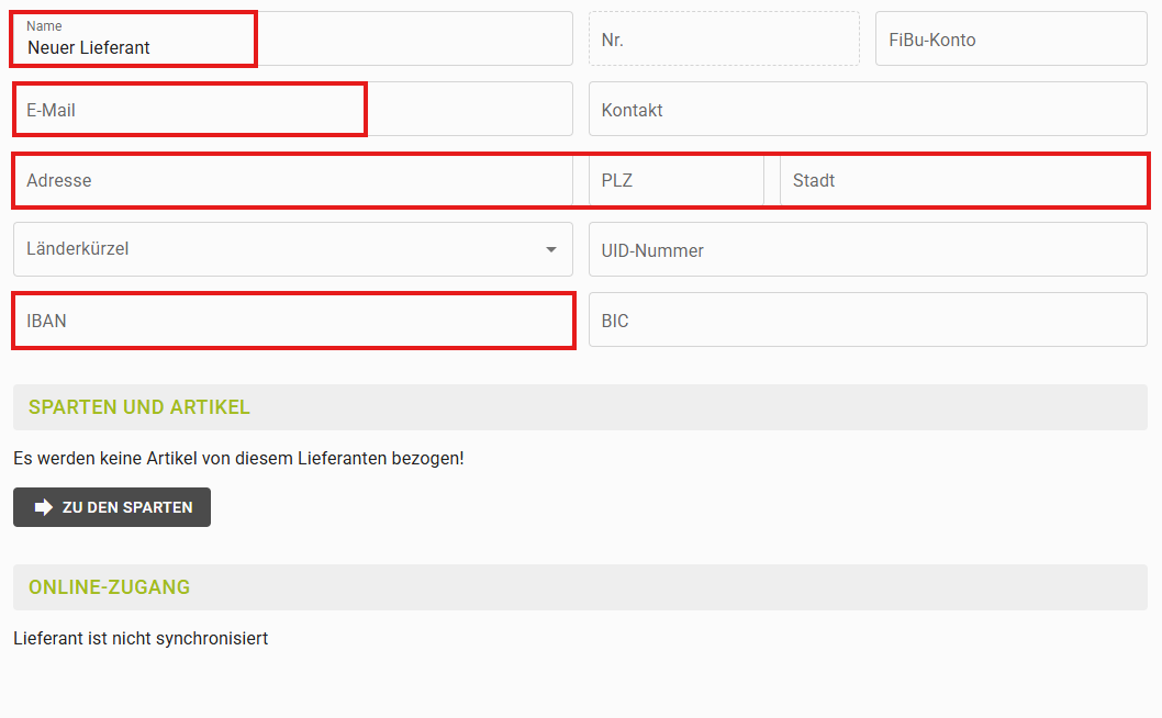 Je nachdem, welche Produkte der Lieferant verkauft, müssen 1-3 Sparten angelegt werden. Pro MWSt.-Satz eine Sparte.