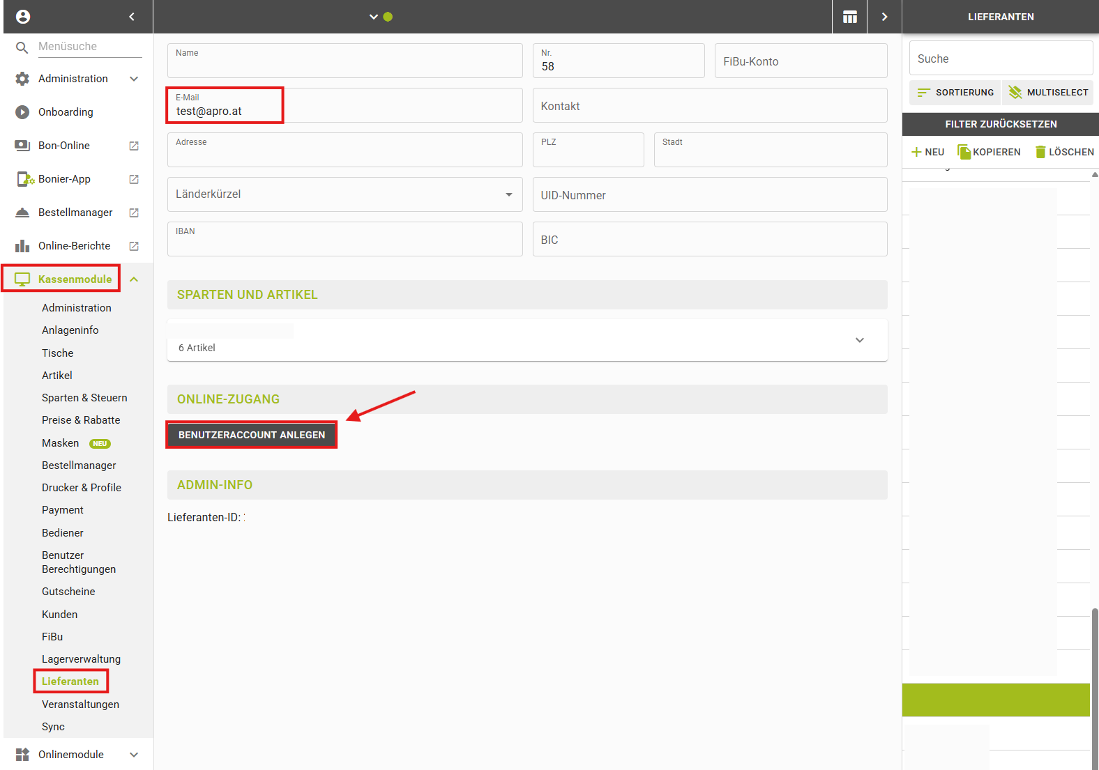 Kassenmodule > Lieferanten > den Lieferanten auswählen > Button "Benutzeraccount anlegen" klicken