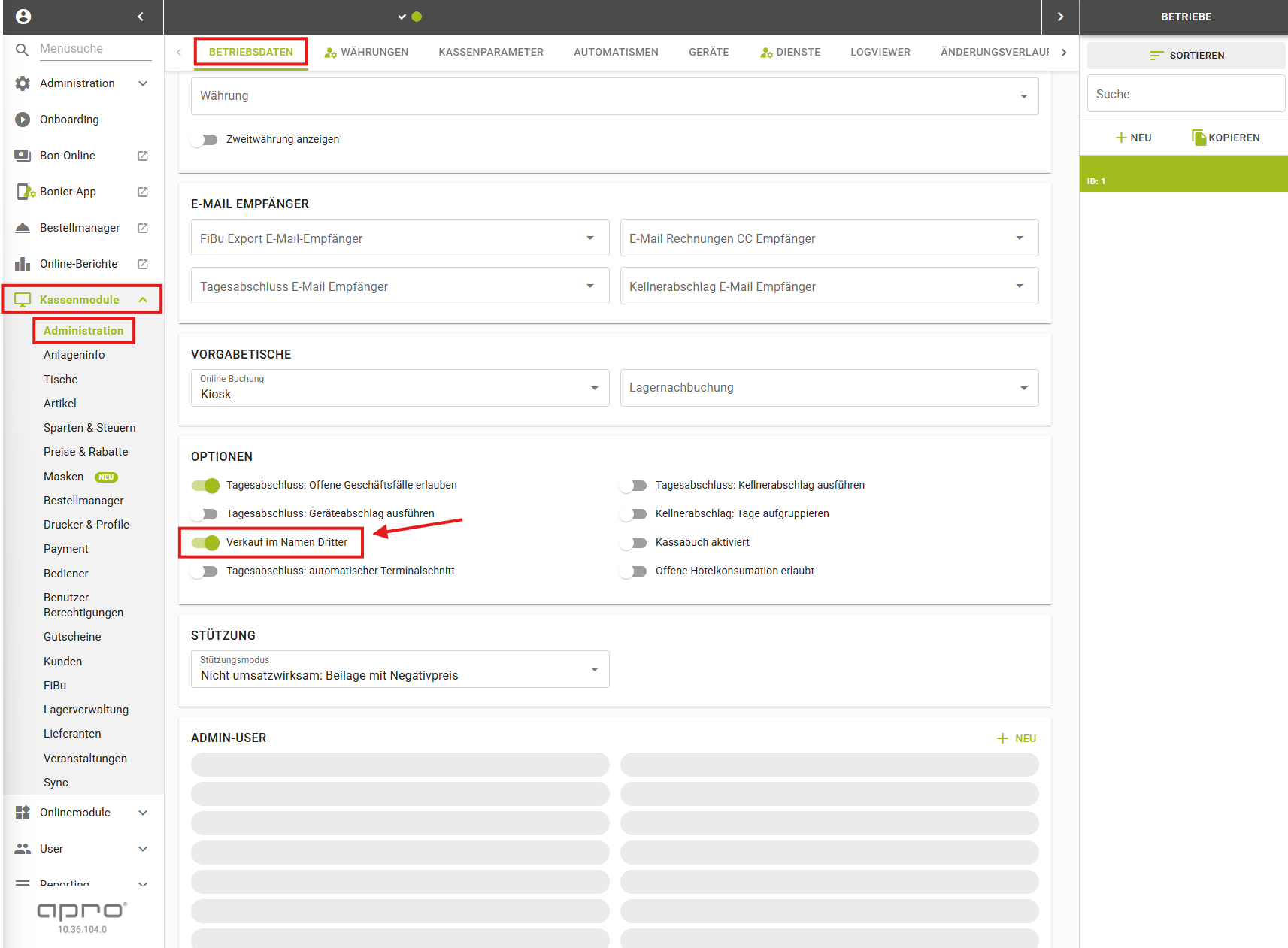 Wo sieht man, ob der Verkauf im Namen Dritter aktiviert ist? Unter Kassenmodule > Administration> Betriebsdaten > Optionen> Verkauf im Namen Dritter: