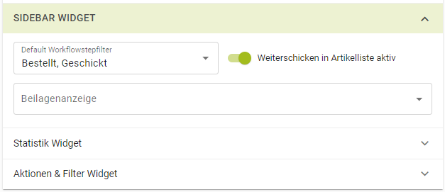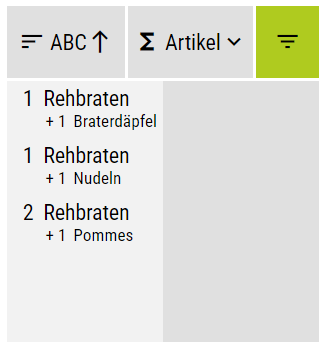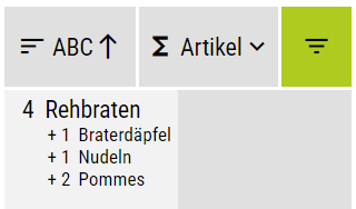 ![]() ![]() ![]() | Das Sidebar-Widget beinhaltet alle Einstellungen der Summenleiste. Standardmäßig werden in der SUmmenleiste nur Artikel im Status "Bestellt" visualisiert, es können jedoch mehrere Status dargestellt werden. Weiterschicken in Artikelliste aktiv: mit diesem Schalter kann der OK-Button in der Summenleiste ein- und ausgeblendet werden, d.h. bei inaktivem Schalter, kann aus der SUmmenleiste nichts geschickt werden. Beilagenanzeige: Hier kann zwischen 3 Optionen gewählt werden: