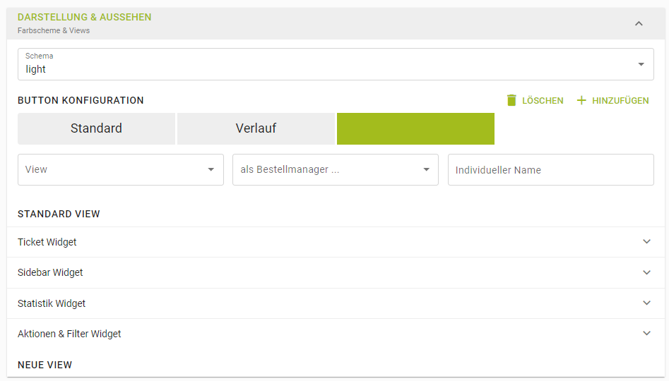 ![]() | Unter Darstellung & Aussehen kann das Scheme definiert werden (hell, dunkel, grün) sowie die Button-Konfiguration. In der Button-Konfiguration könne z.B. verschiedene Bestellmanager über einen Bestellmanager aufgerufen werden, mann kann quasi zwischen den Bestellmanagern "hin- und herschalten". Zusätzlich kann hier der Verlauf bzw. unterschiedliche Ansichten angelegt werden. Eine View definiert, ob ein Bestellmanager Bestellungen bspw. als Tickets anzeigt werden. (Standard) oder als Tabellenansicht (Menü) |