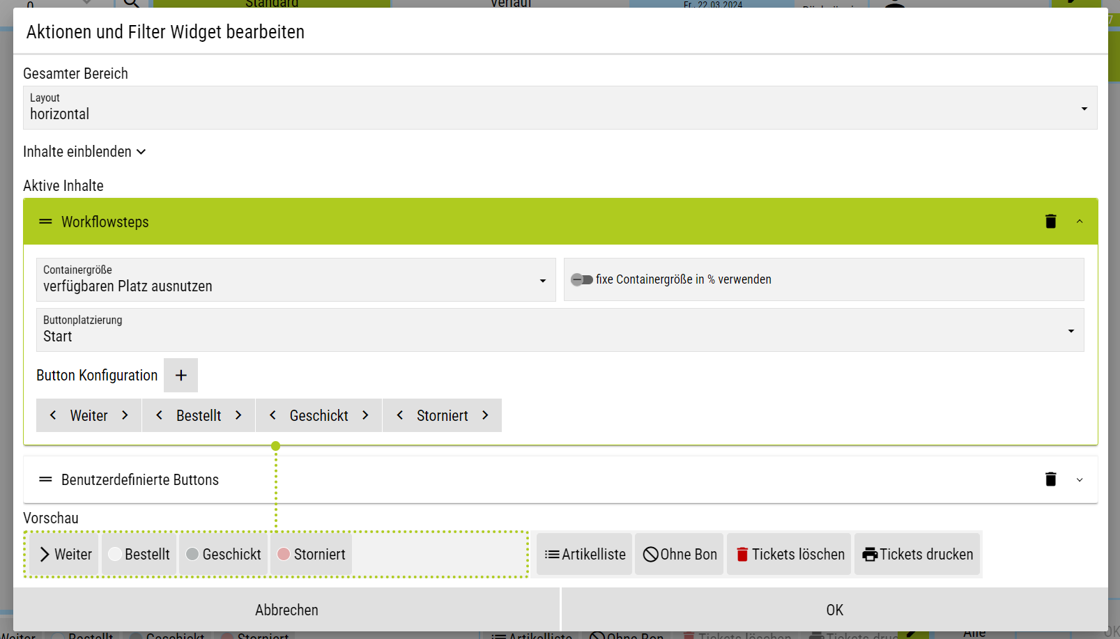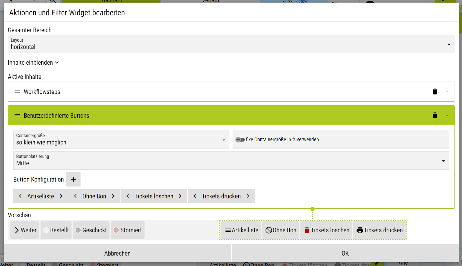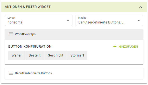 ![]() | Das Aktionen und Filter-Widget kann als Leiste horizontal, oder auch vertikal dargestellt werden. Dabei unterscheidet man grundsätzlich 2 Bereiche: Filter & Workflowschritte: Hier kann im Ticketbereich auf einzelne Status gefiltert werden wenn man einmal kurz darauf klickt - bei Klick auf "Storniert" sieht man bspw. alle Tickets, die einen stornierten Artikel beinhalten. Wenn man einzelne Artikel, bzw. gesamte Tickets markiert und lange auf dem jeweiligen Button bleibt, dann werden die Artikel direkt in den selektierten Status versetzt. So können bspw. aus unterschiedlichen Tickets mit unterschiedlichen Status Artikel weitergeschickt werden. Benutzerdefinierte Buttons: Diese beinhalten eine Reihe ausgewählter Funktionen, die laufend erweitert werden.