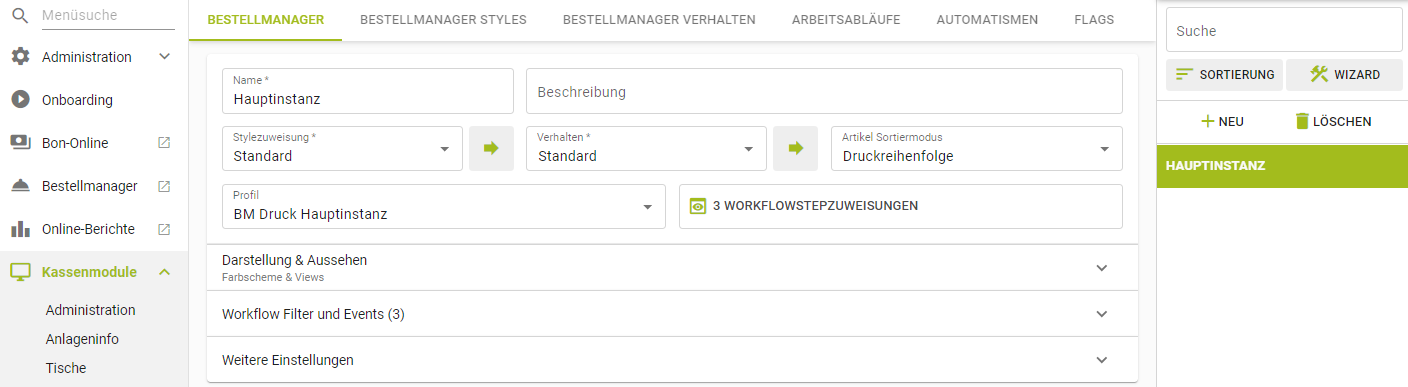 ![]() | Unter Kassenmodule > Bestellmanager findet man alle Einstellungsmöglichkeiten der Bestellmanager. Diese selektiert man in der rechten Spalte, anschließend werden die jeweils zugehörigen Einstellungen geladen. Im ersten Reiter können Verhalten, Styles, Profile und Workflowschritte angepasst werden, sowie die Inhalte die auf denm Bestellmanager angzeigt werden definiert werden. Es können beliebig viele Styles, Verhalten und Workflows angelegt werden, diese können ebenfalls beliebig vielen Bestellmanagern zugewiesen werden. |