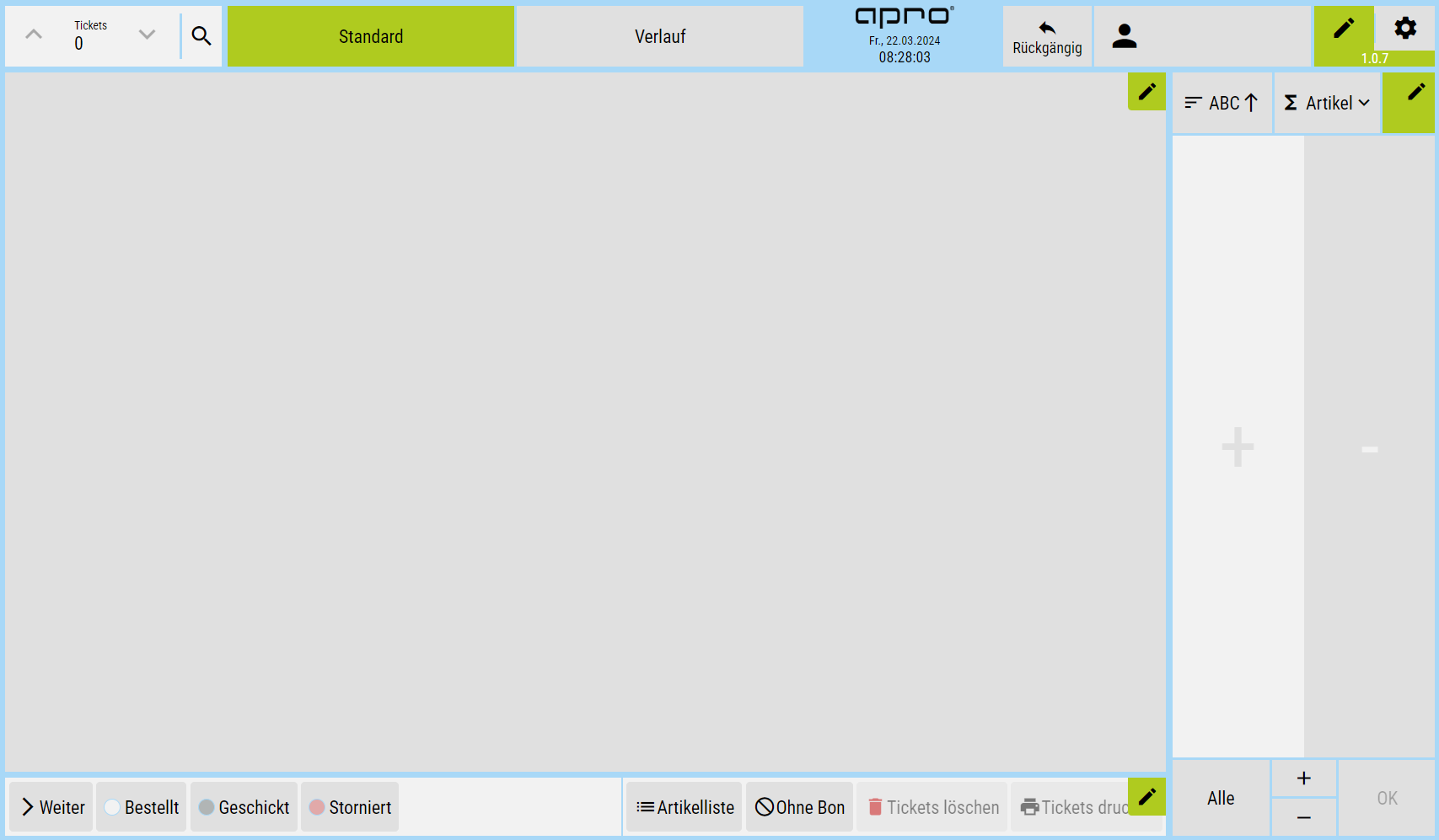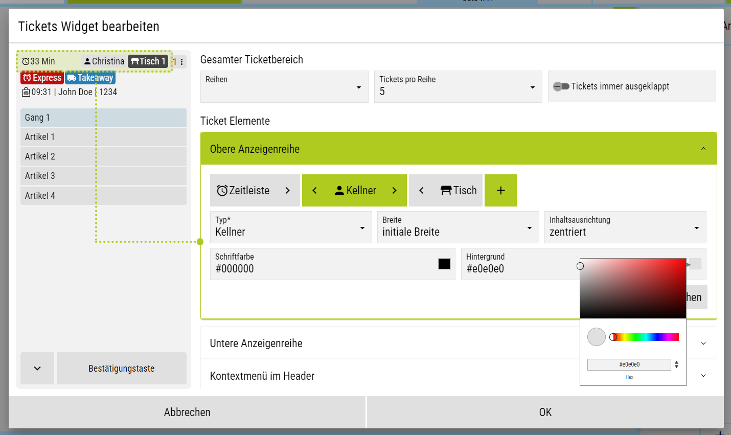 ![]() | Bei Klick auf das Stiftsymbol im Ticketbereich können grunsätzliche Funktionen ein- und ausgeschaltet werden, die für den Ticektbereich relevant sind, wie. z.B. das Ein- und Ausblenden der Zeitangabe oder des Bedieners. Aber es können auch Funktionen angepasst werden, wie z.B. ob ein inaktiver Gang bedienbar sein soll oder nicht. |